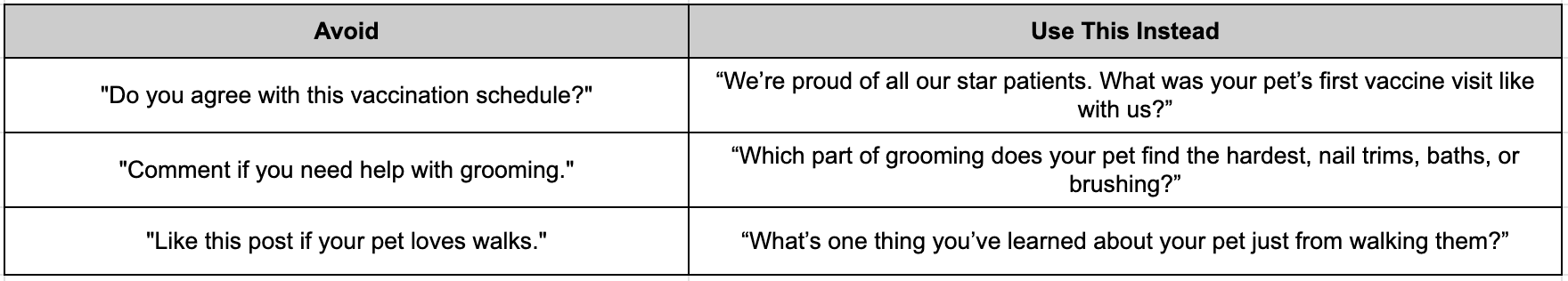 If your practice never replies to pet owners who take the time to comment, they will quickly learn not to bother. This destroys the compounding benefit of reply-driven engagement and signals to the algorithm that your content is not fostering a community.